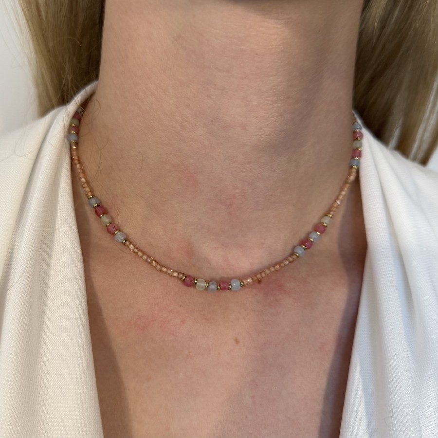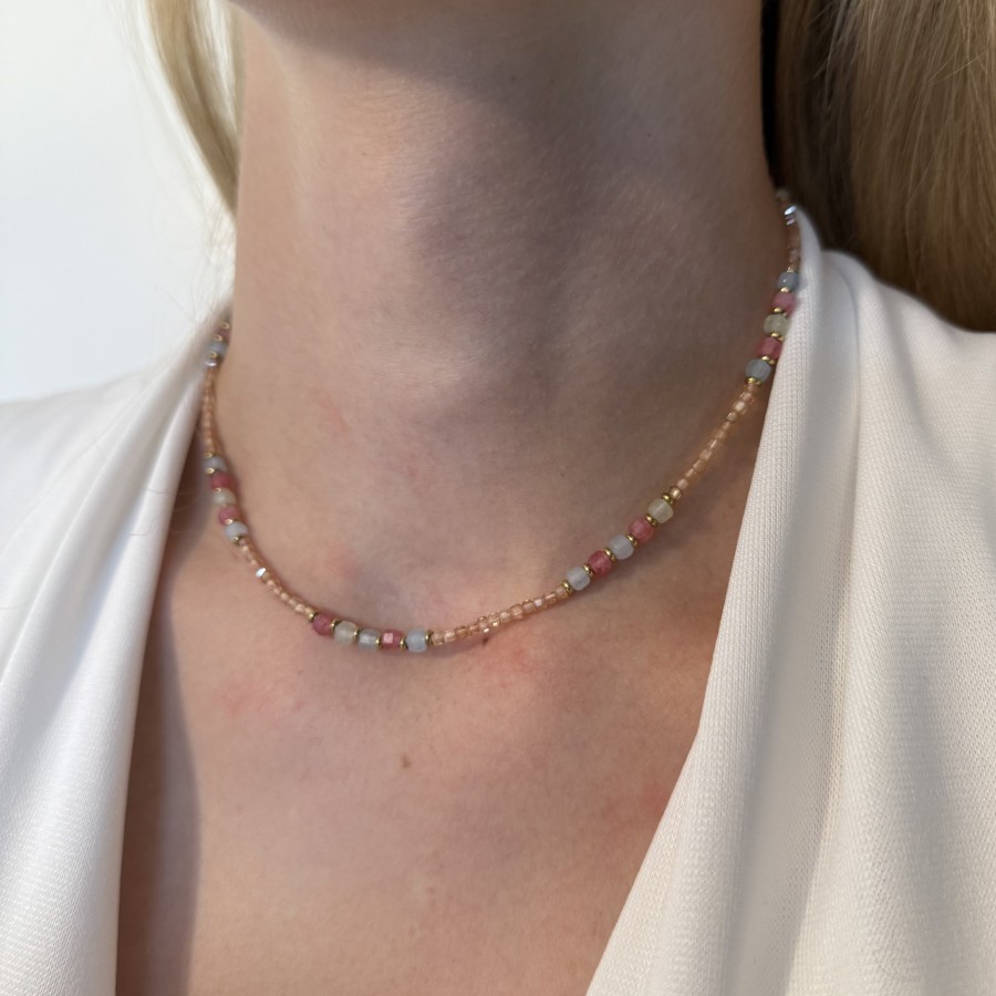 Delikatne, pastelowe koraliki i złoty łańcuszek tworzą subtelną kompozycję, która pięknie dopełnia codzienne i wakacyjne stylizacje.