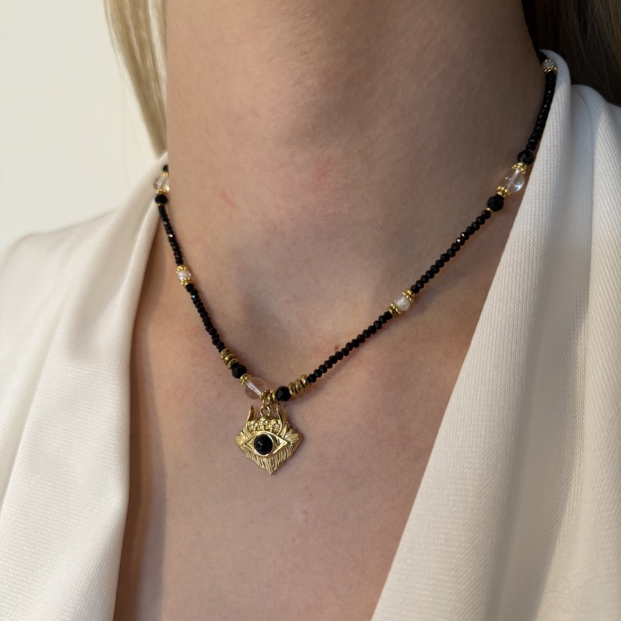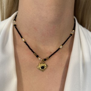 Złota zawieszka z czarnym kryształem otoczona drobnymi koralikami w kolorze nocy tworzy naszyjnik o wyjątkowej sile.