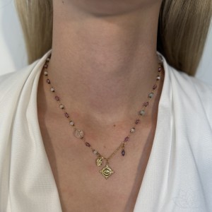 Materiały: stal szlachetna pozłacana, koraliki, zawieszka z cyrkonią (oko proroka)