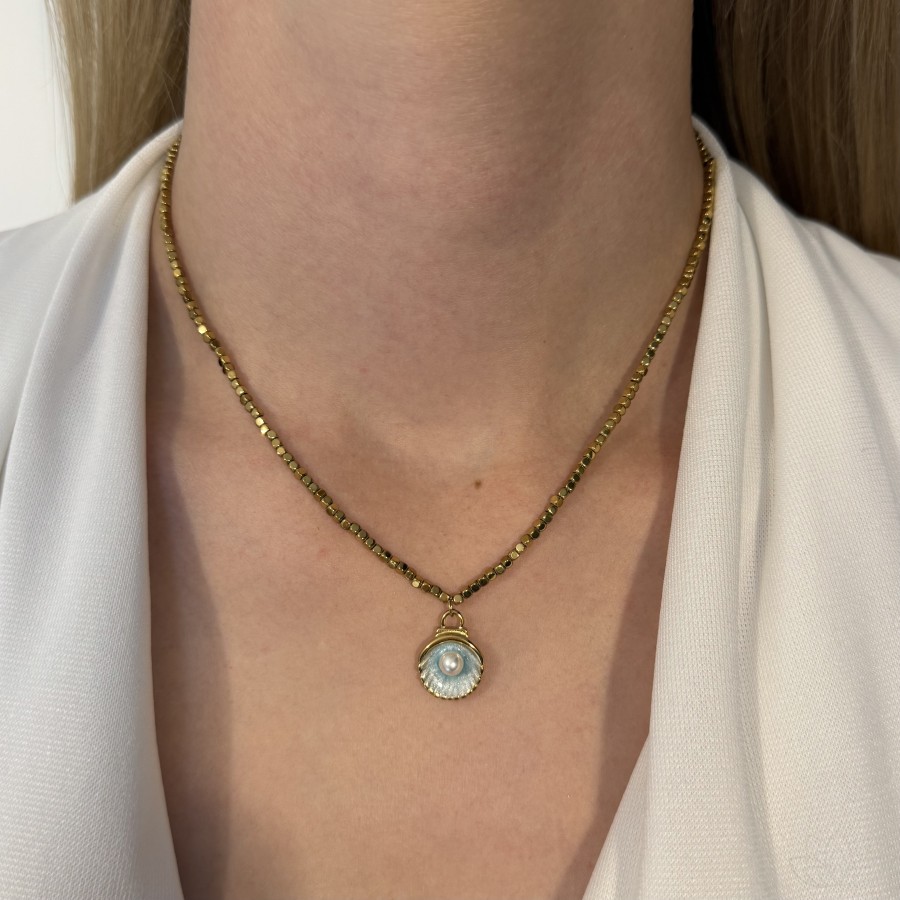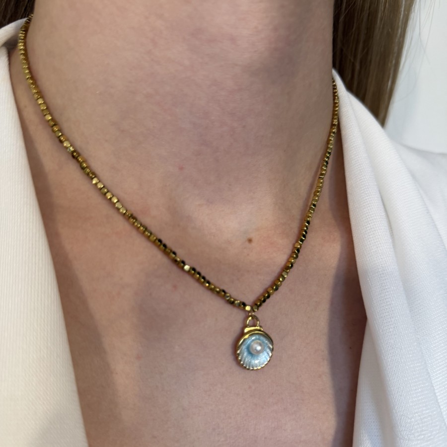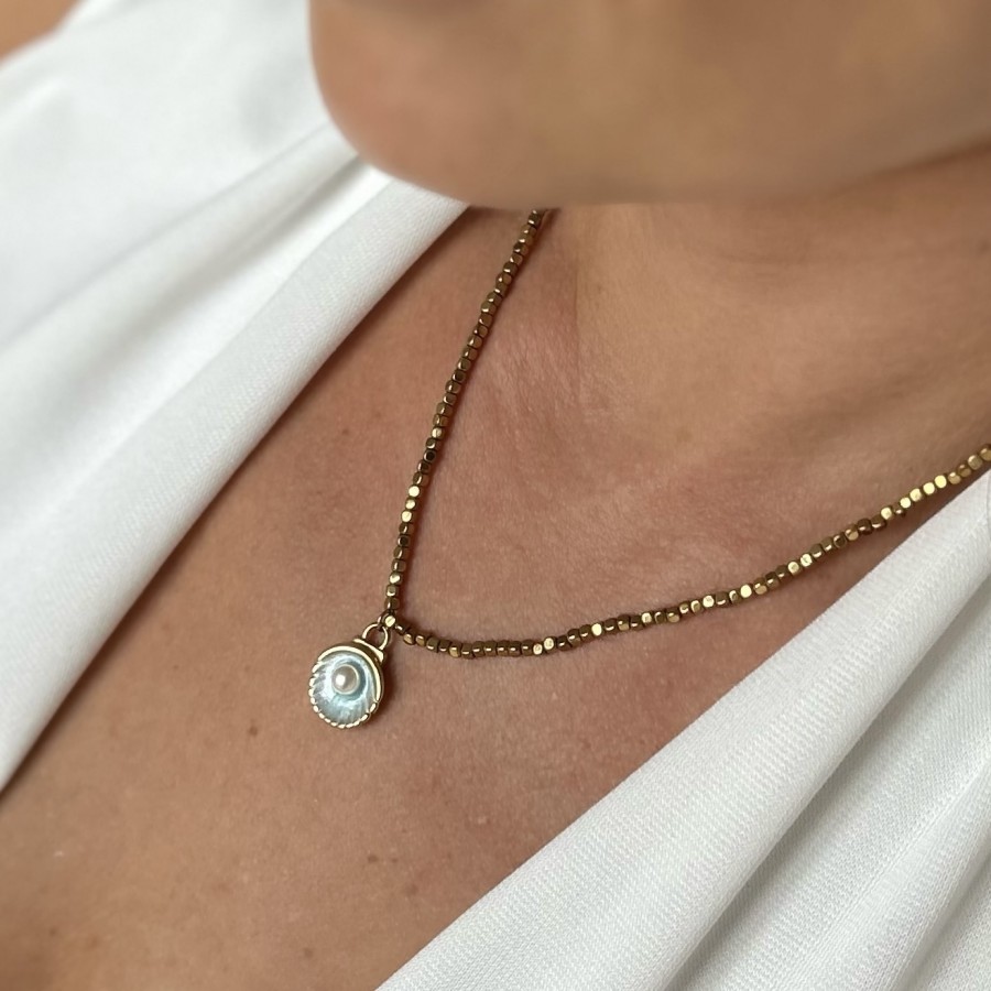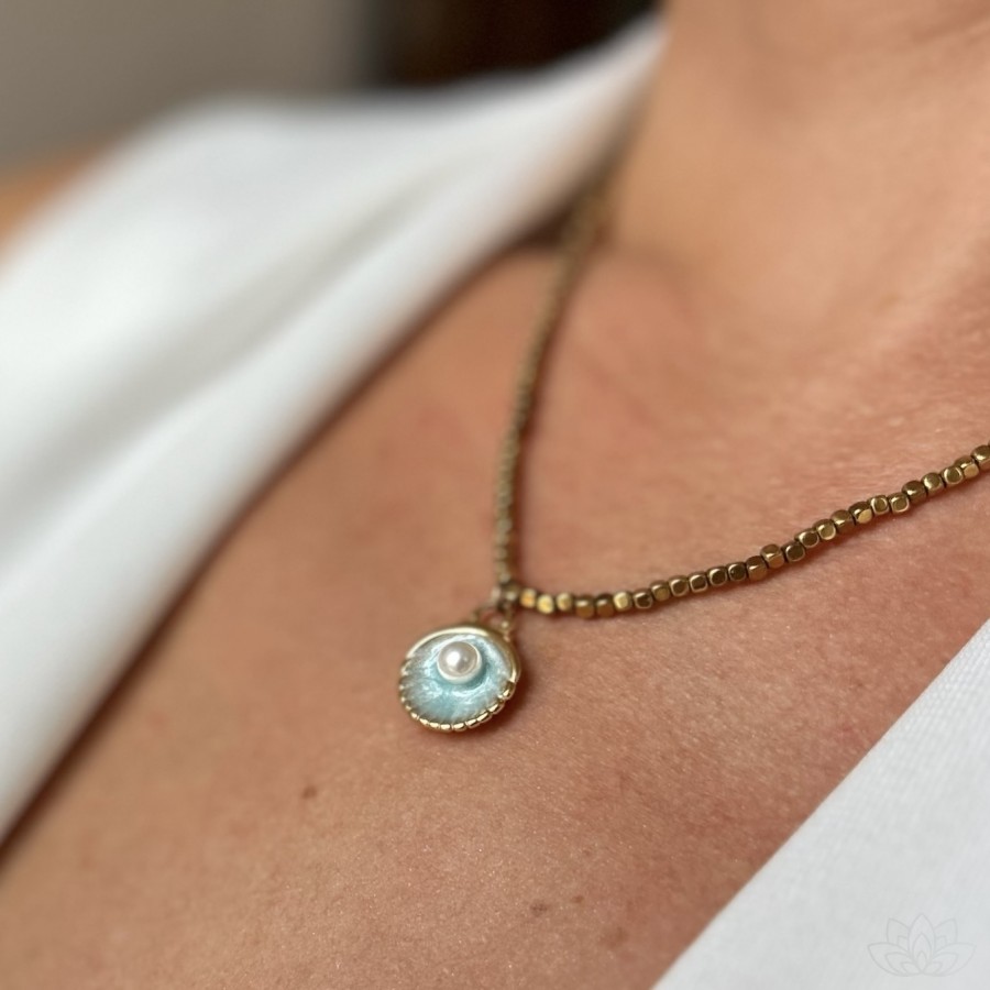 Ten naszyjnik to ukłon w stronę kobiecej esencji – delikatnej, ale silnej jak fala. Zawieszka z naturalnej muszli, wykończona perłą, przypomina o mocy płynącej z wnętrza i o pięknie, które nie potrzebuje ozdobników.