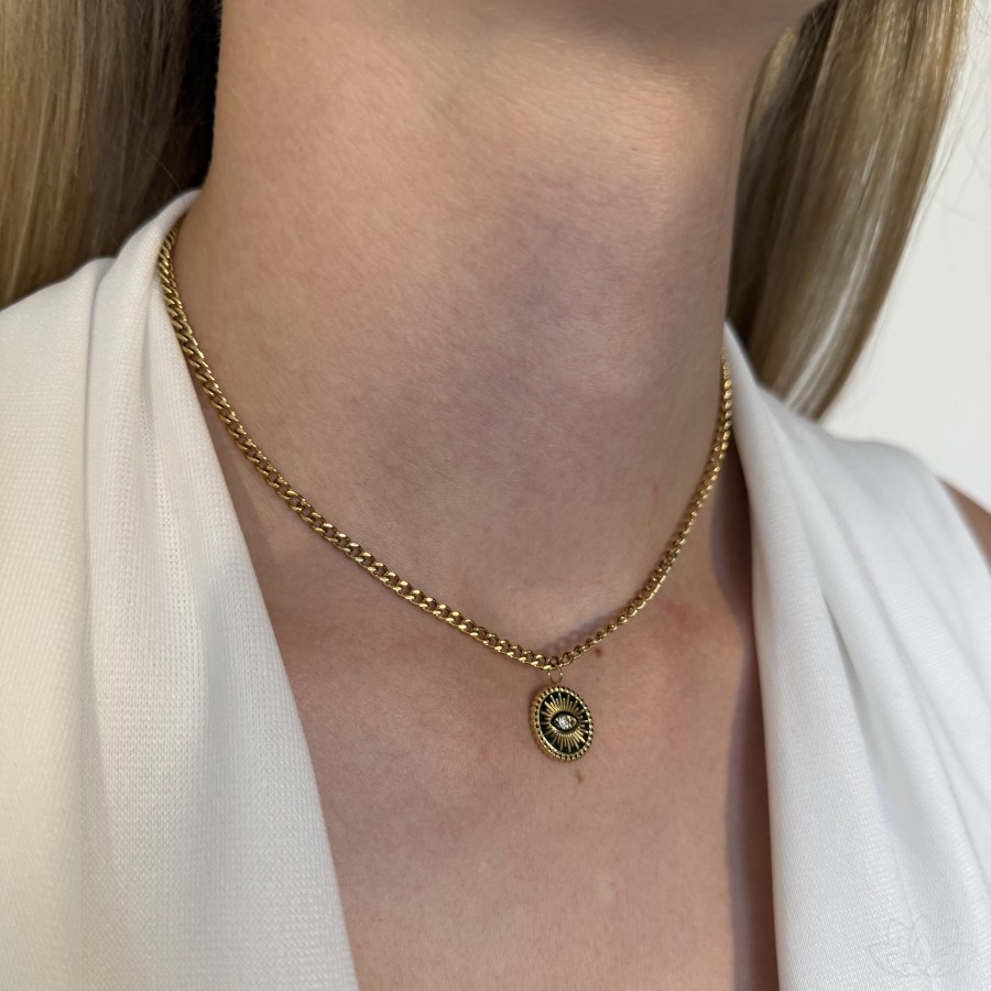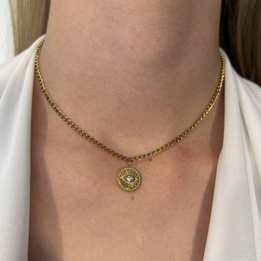 Pozłacany łańcuszek symbolizuje siłę i stabilność, a zawieszka z okiem proroka – znana jako amulet ochrony – wspiera w codziennym oczyszczaniu przestrzeni z tego, co nie służy.